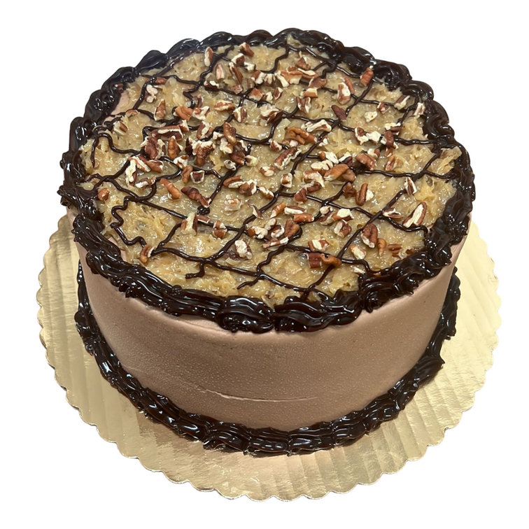 A decadent, multi-layered dessert featuring two layers of rich chocolate cake, filled and topped with a traditional German chocolate topping made of caramel, coconut, and pecans. The sides are finished with chocolate buttercream, and the cake is completed with a luscious chocolate fudge icing borders. This classic cake is known for its indulgent combination of chocolate, caramel, coconut, and pecans.