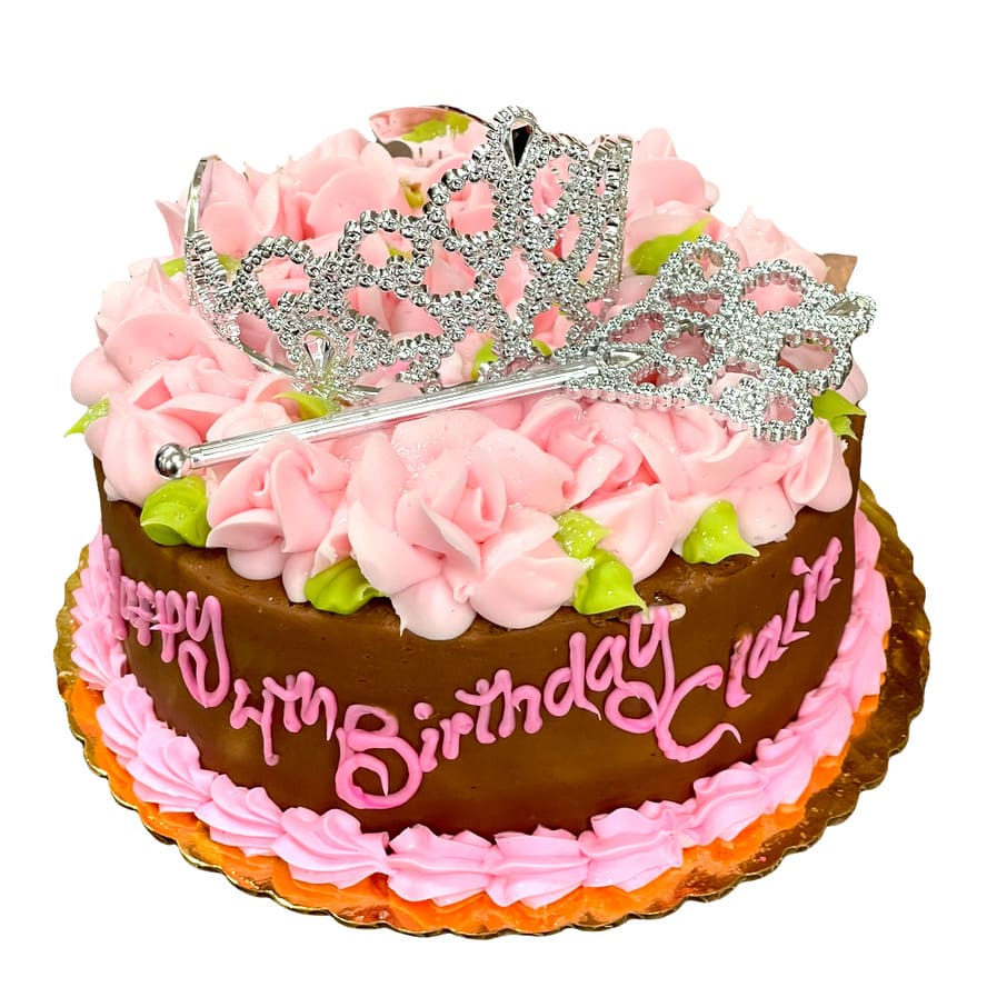 Cake decorated with roses and topped with a Princess Crown and Wand set!