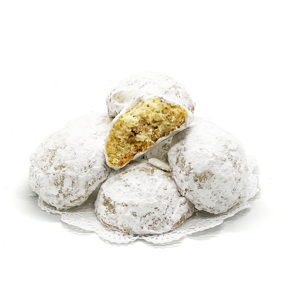 A buttery almond shortbread cookie ball filled with crushed pecans & rolled in powdered sugar.