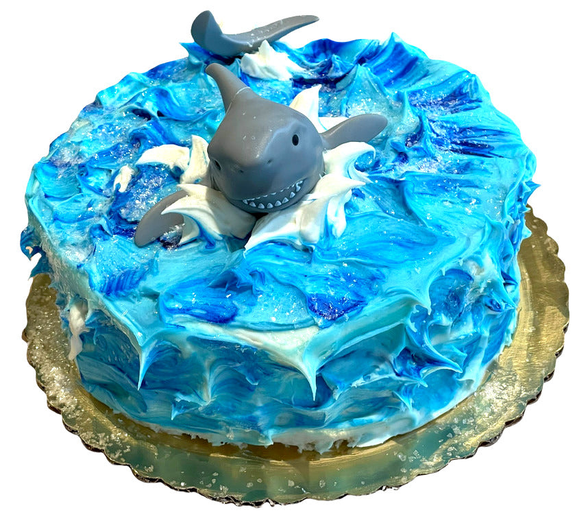 Cake hand decorated with 3D waves, topped with a shark. (Shark figurine may vary depending on availability. Please call 612-922-4341 with inquiries about our current figurine.)