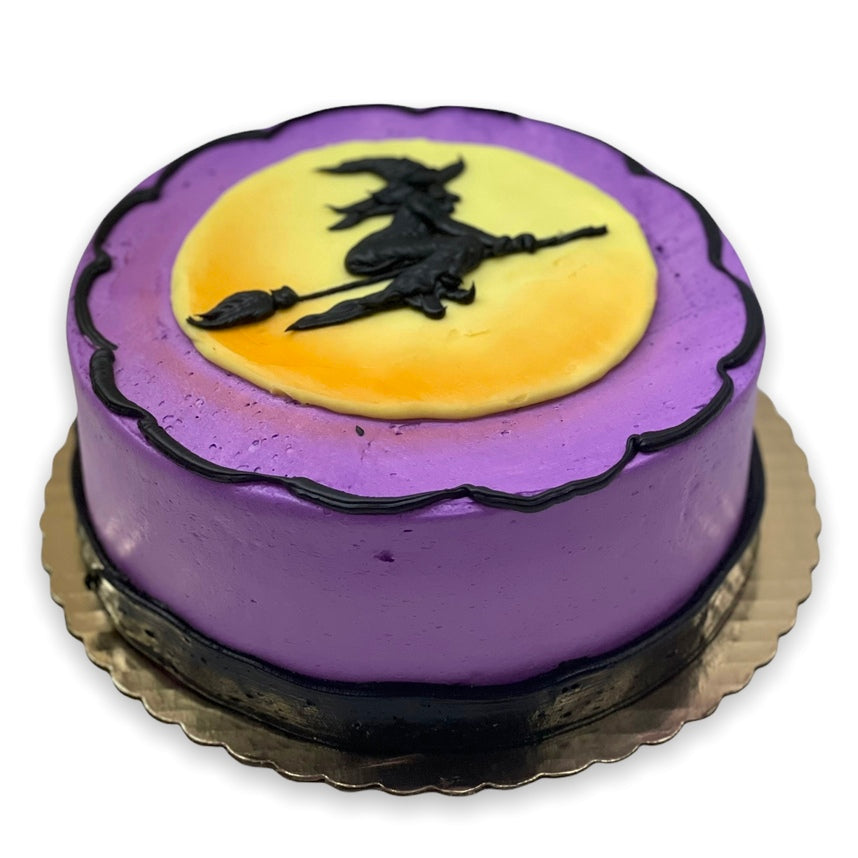 A cake iced with purple Frosting and hand-decorated with a witch on a broom. Your choice of flavor and filling!